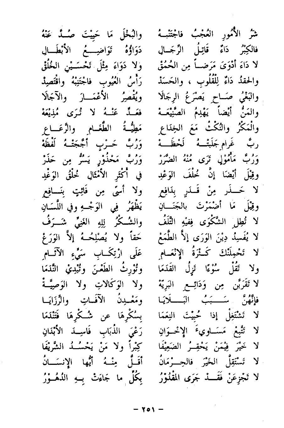 شَرُ الأُمُورِ العُجْبُ فاجْتَنْبهُ ... والبُخْلَ مَا حَيِيْتَ صُدَّ عَنْهُ
