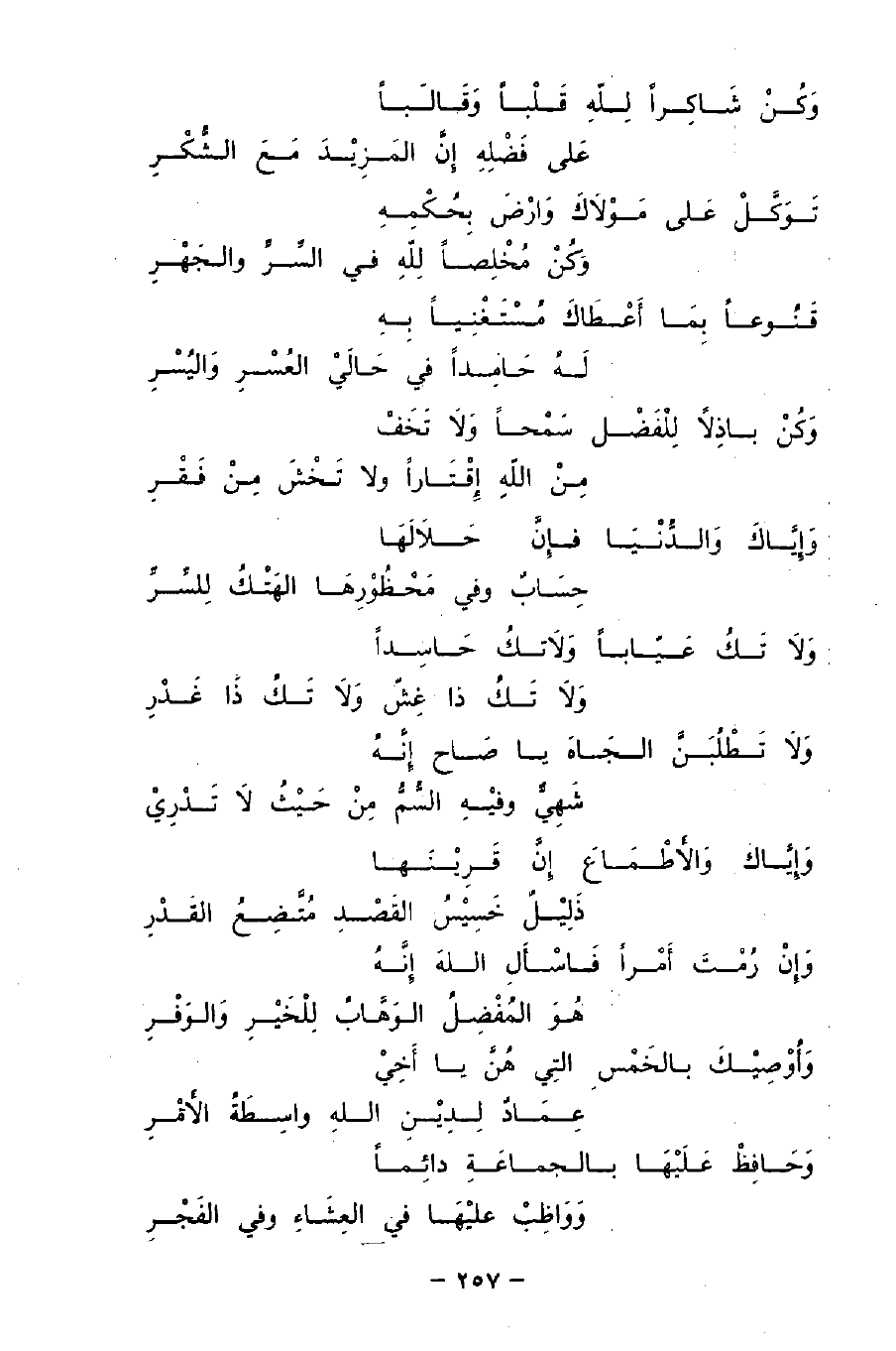 وَأُوْصِيْكَ بِالخَمْسِ التِي هُنَّ يا أخِيْ ... عِمَادٌ لدِيْنِ الله وَاسطَةُ الأَمْرِ