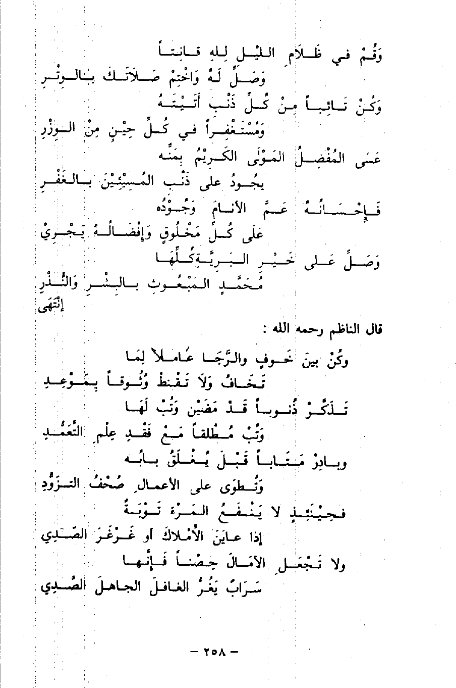 وَقُمْ في ظَلاَمِ اللَّيْلِ لله قانتًا ... وَصَلِّ لَهُ وَاخْتِمْ صَلاَتَكَ بالوِتْرِ
