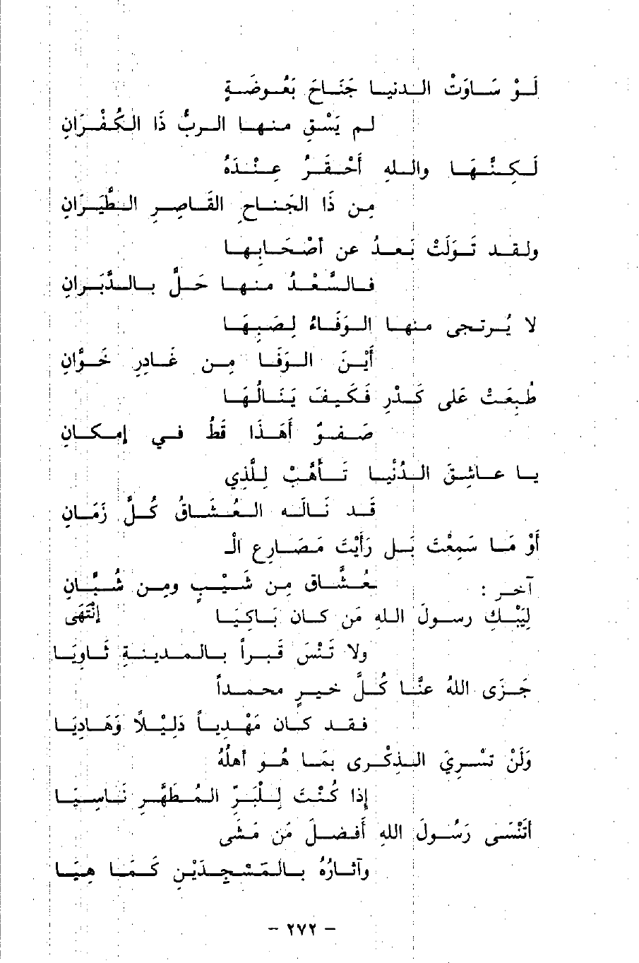 لَوْ سَاوَتِ الدنيا جَنَاحَ بَعُوضَةٍ ... لم يَسْقِ منها الربُّ ذَا الكُفْرَانِ