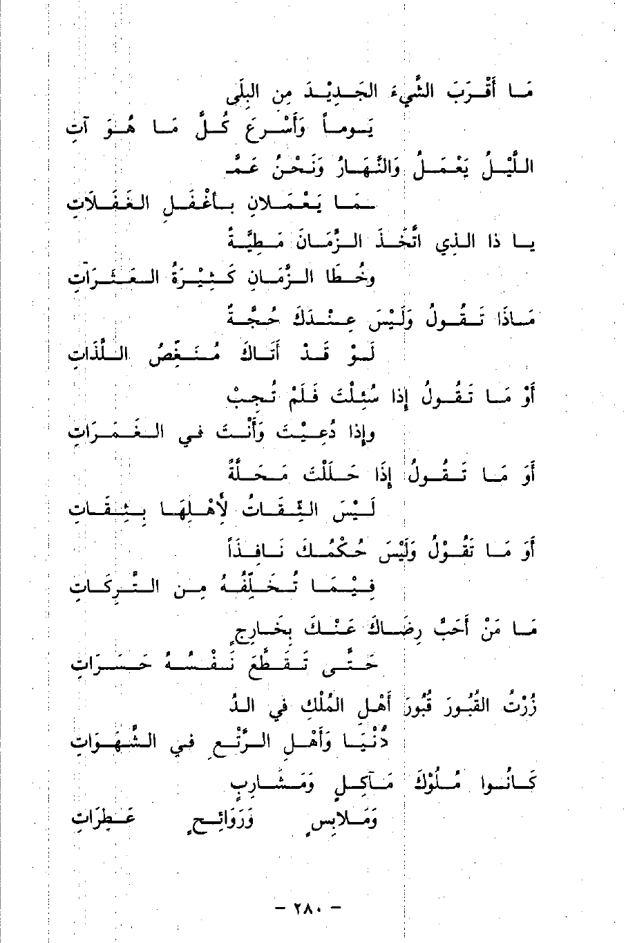 مَا أَقْرَبُ الشَّيءَ الجَدِيْدَ مِن البِلَى ... يَومًا وَأَسْرعَ كُلَّ مَا هُوَ آتِ