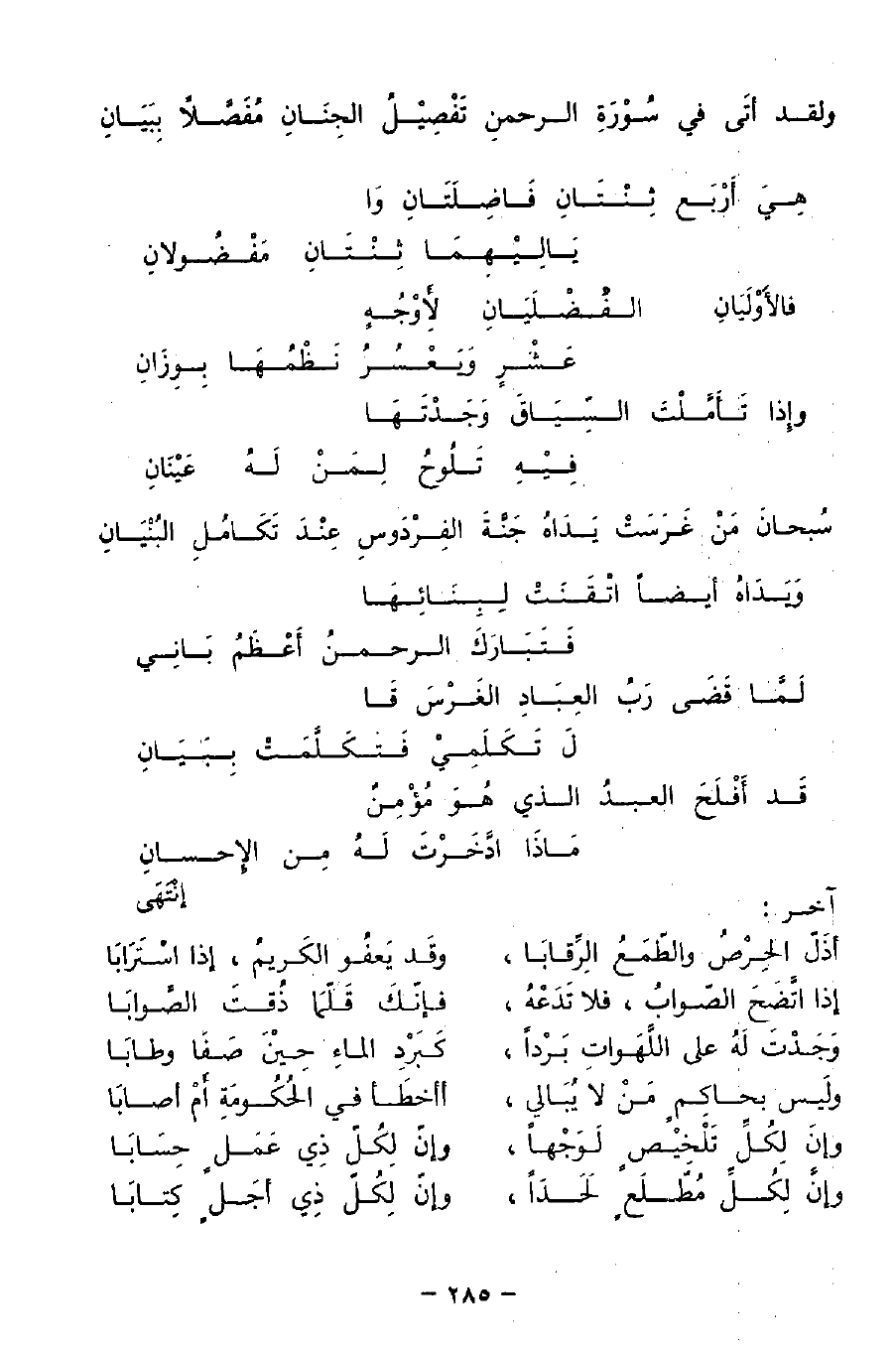 ولقد أتَى في سُوْرَةِ الرحمنِ ... تَفْصِيْلُ الجِنَان مُفَصَّلاً بِبَيَانِ