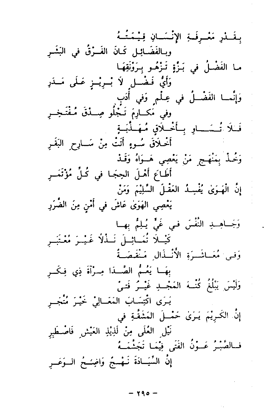 بِقَدْرِ مَعْرِفَةِ الإِنْسَانِ قِيْمَتُهُ ... وبالفَضَائِل كَانَ الفَرْقُ في البَشَرِ