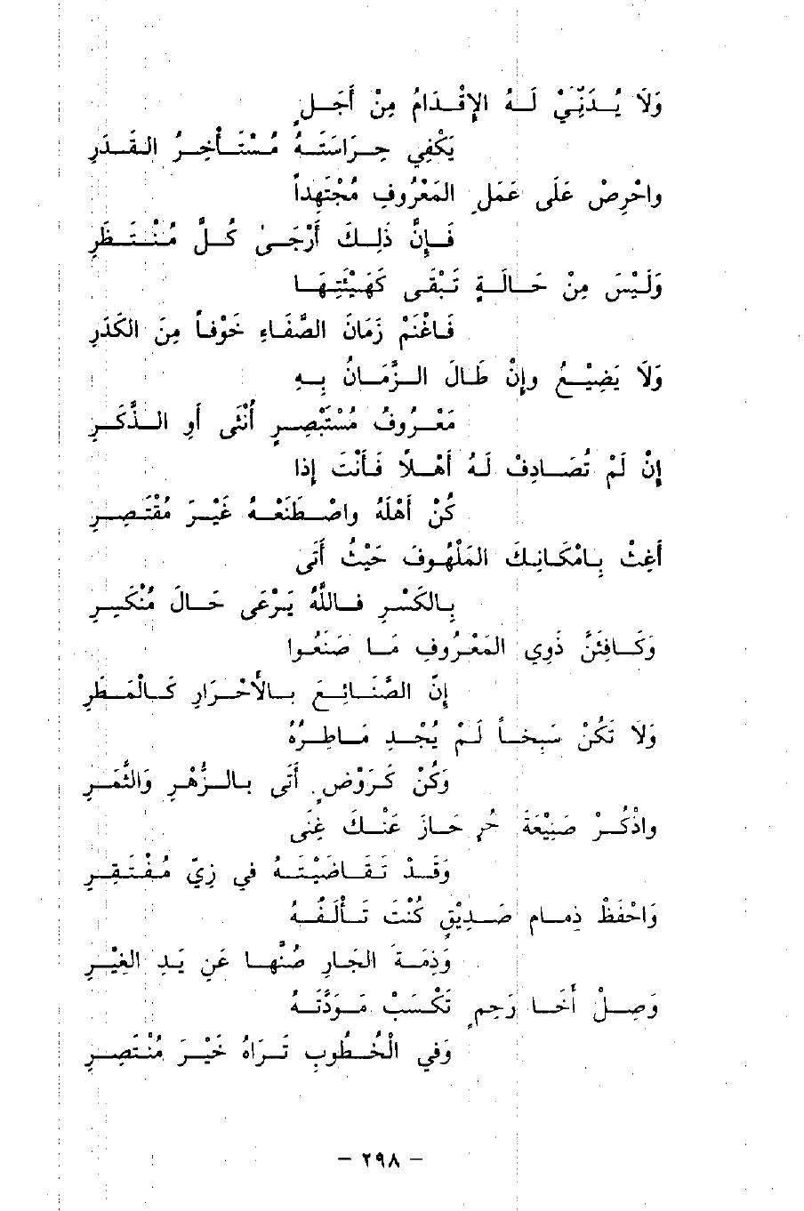 واحْرِصْ عَلَى عَمَلِ المَعْرُوفِ مُجْتَهِدًا ... فَإِنَّ ذَلِكَ أَرْجَى كُلَّ مُنْتَظَرِ