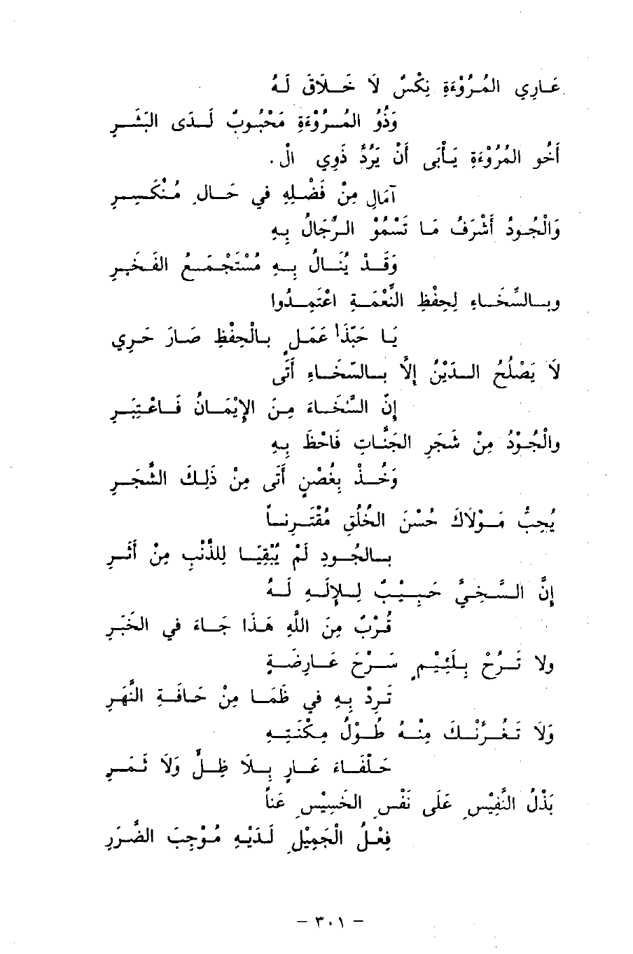 عَارِي المُرْوْءَةِ نِكْسٌ لاَ خَلاَقَ لَهُ ... وَذُوُ المُرُوْءَةِ مَحْبُوبٌ لَدَى البَشَرِ