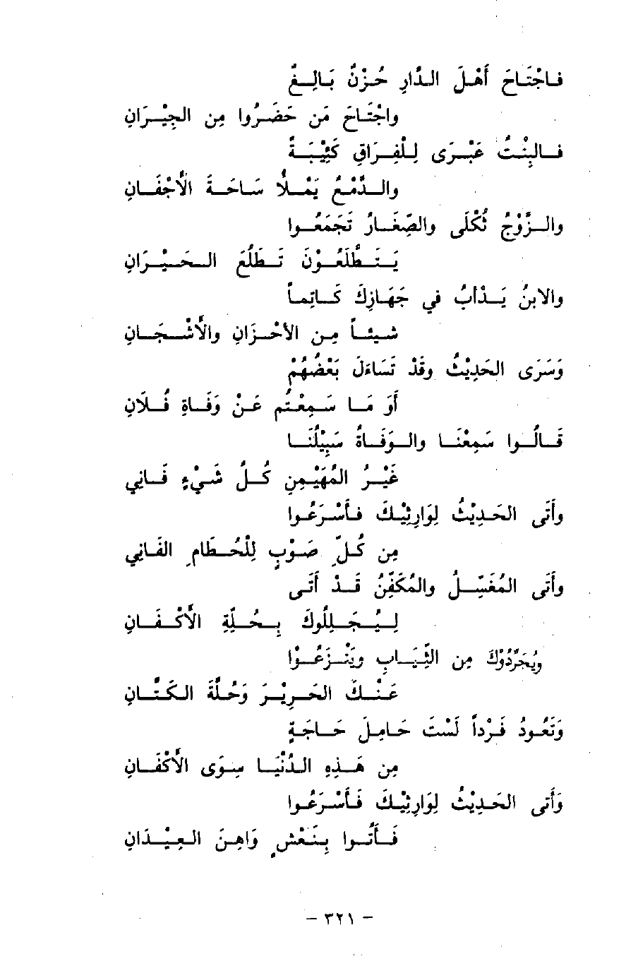 وَسَرَى الحَدِيْثُ وَقَدْ تَسَاءَلْ بَعْضُهُم ... أَوْ مَا سَمِعْتُم عَنْ وَفَاةِ فُلانِ