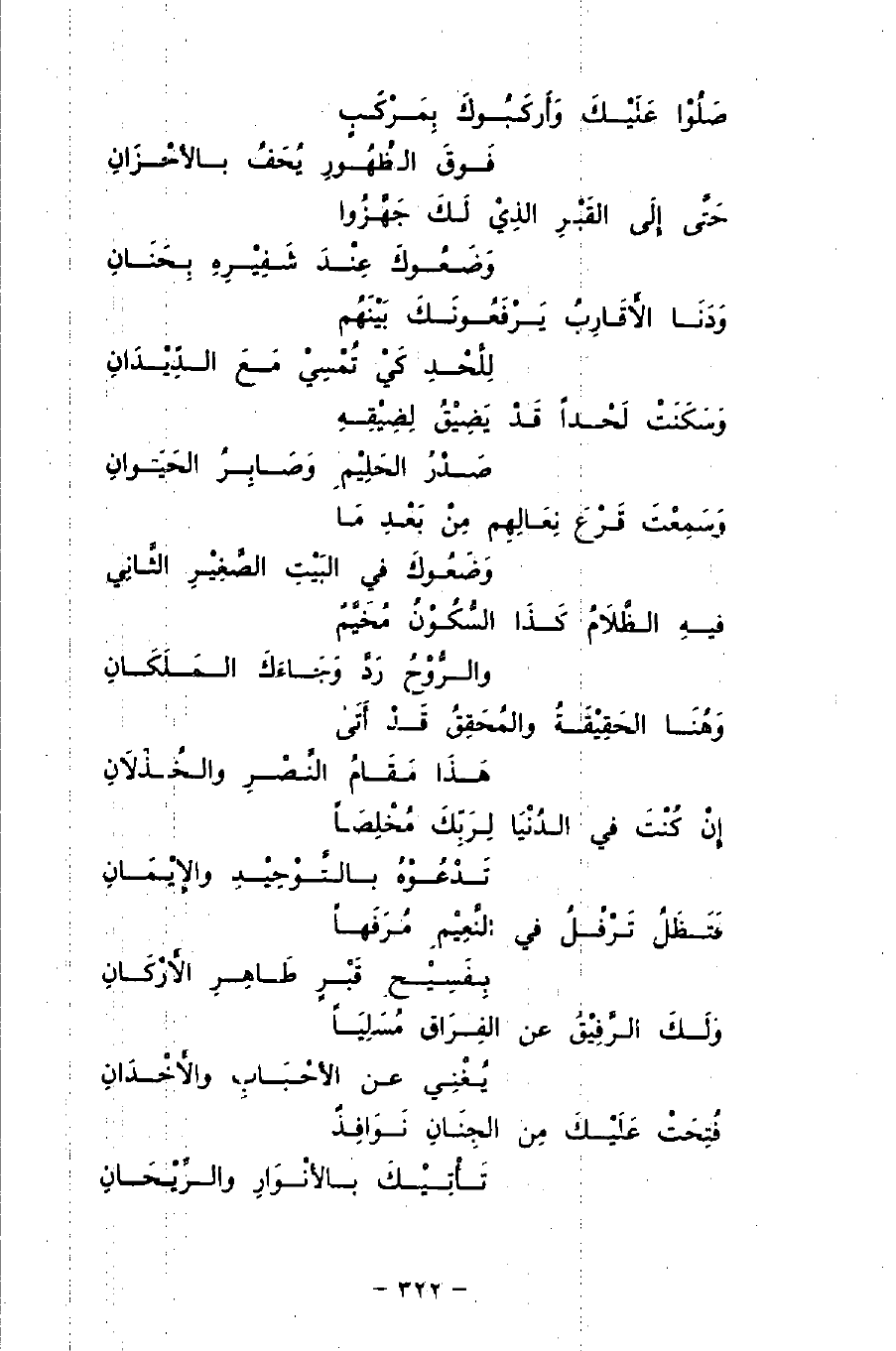 صَلُّوا عَلَيْكَ وَأَرْكَبُوكَ بِمَرْكَبٍ ... فَوْقَ الظُّهُورِ يُحَفُّ بِالأَحْزَانِ