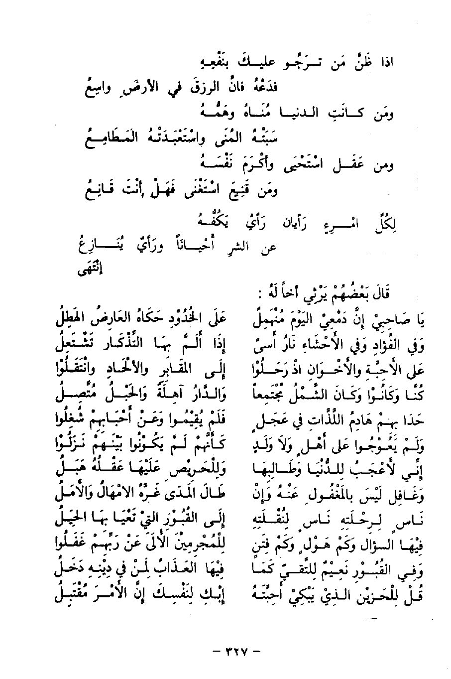 قُلْ لِلْحَزيْن الذِيْ يَبْكِيْ أَحِبَّتَهُ ... ابْكِ لِنَفْسِكَ إِنَّ الأَمْرَ مُقْتَبِلُ