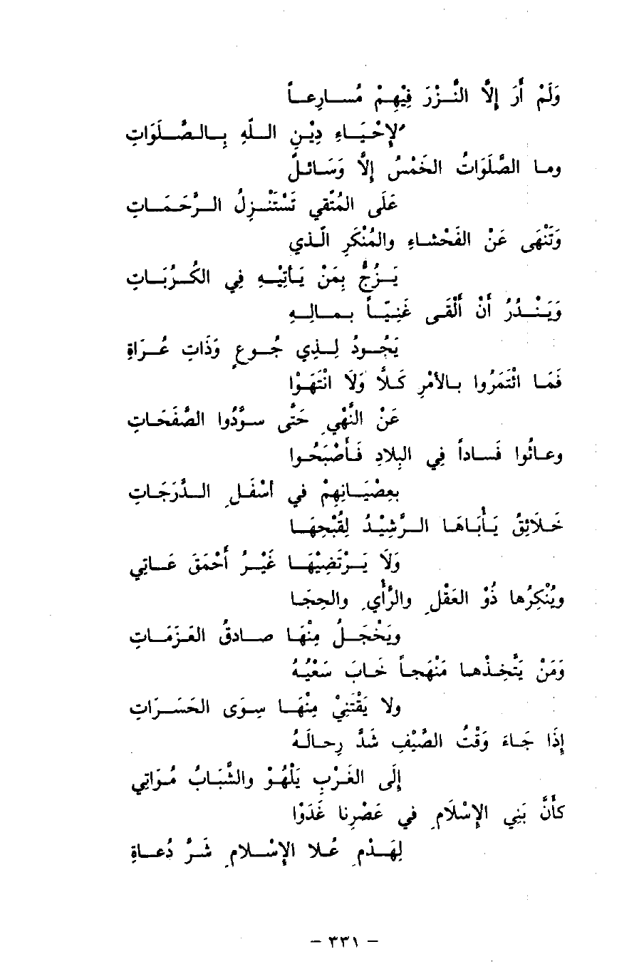 وَلَمْ أَرَ إِلاَّ النَّزْرَ فِيْهِمْ مُسارِعًا ... لإِحْيَاءِ دِيْنِ اللهِ بِالصَّلَوَاتِ