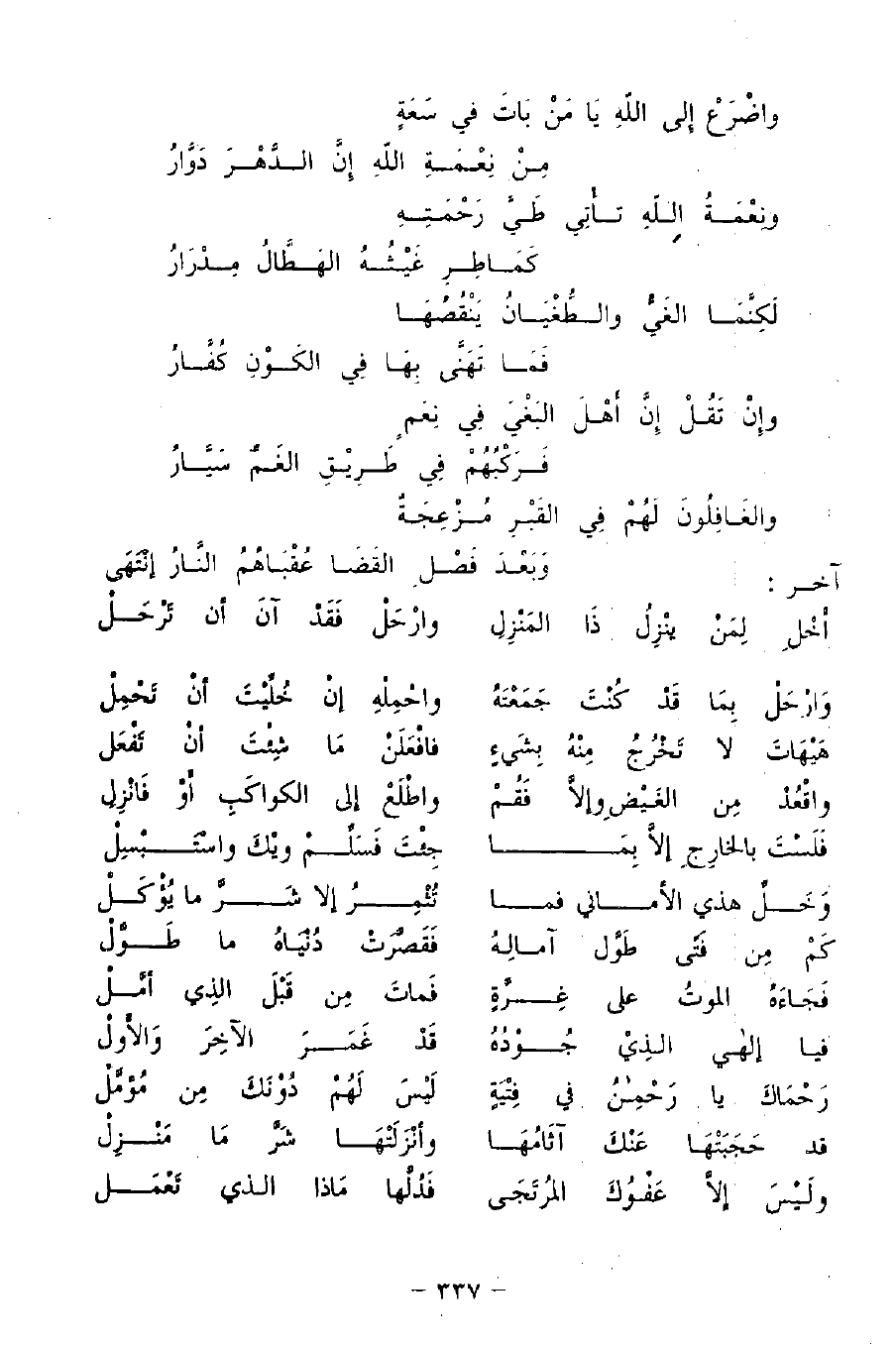 واضْرَعْ إلى اللهِ يَا مَنْ بَاتَ في سَعَةٍ ... مِنْ نِعْمَةِ اللهِ إِنَّ الدَّهْرَ دَوَّارُ