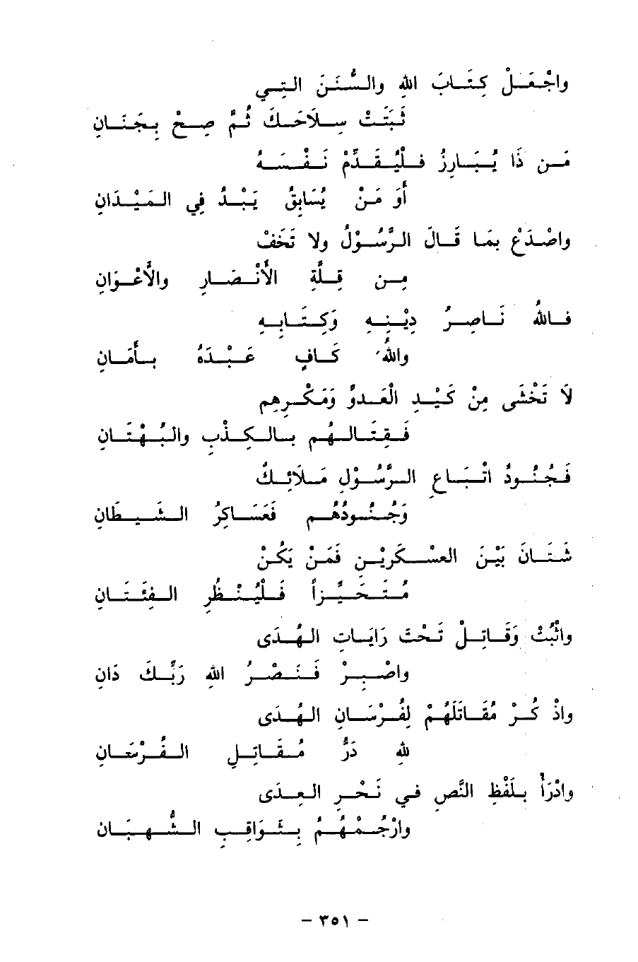 واجْعَلْ كِتَابَ اللهِ والسُّنَنَ التِي ... ثَبَتَتْ سَلاَحَكَ ثُمَّ صِحْ بِجَنَانِ