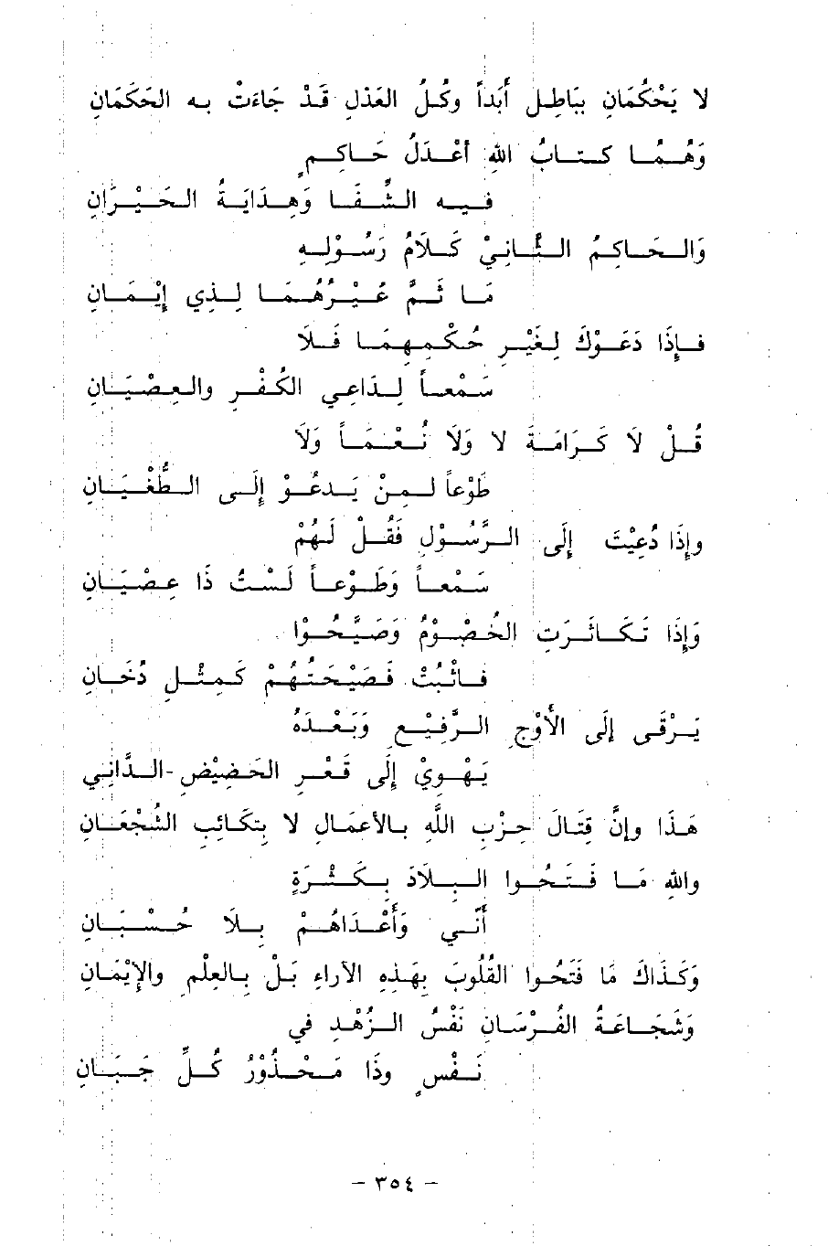 وَهُمُا كتابُ اللهِ أعْدَلُ حَاكِمٍ ... فيه الشِّفَا وَهِدَايَةُ الحَيْرَانِ