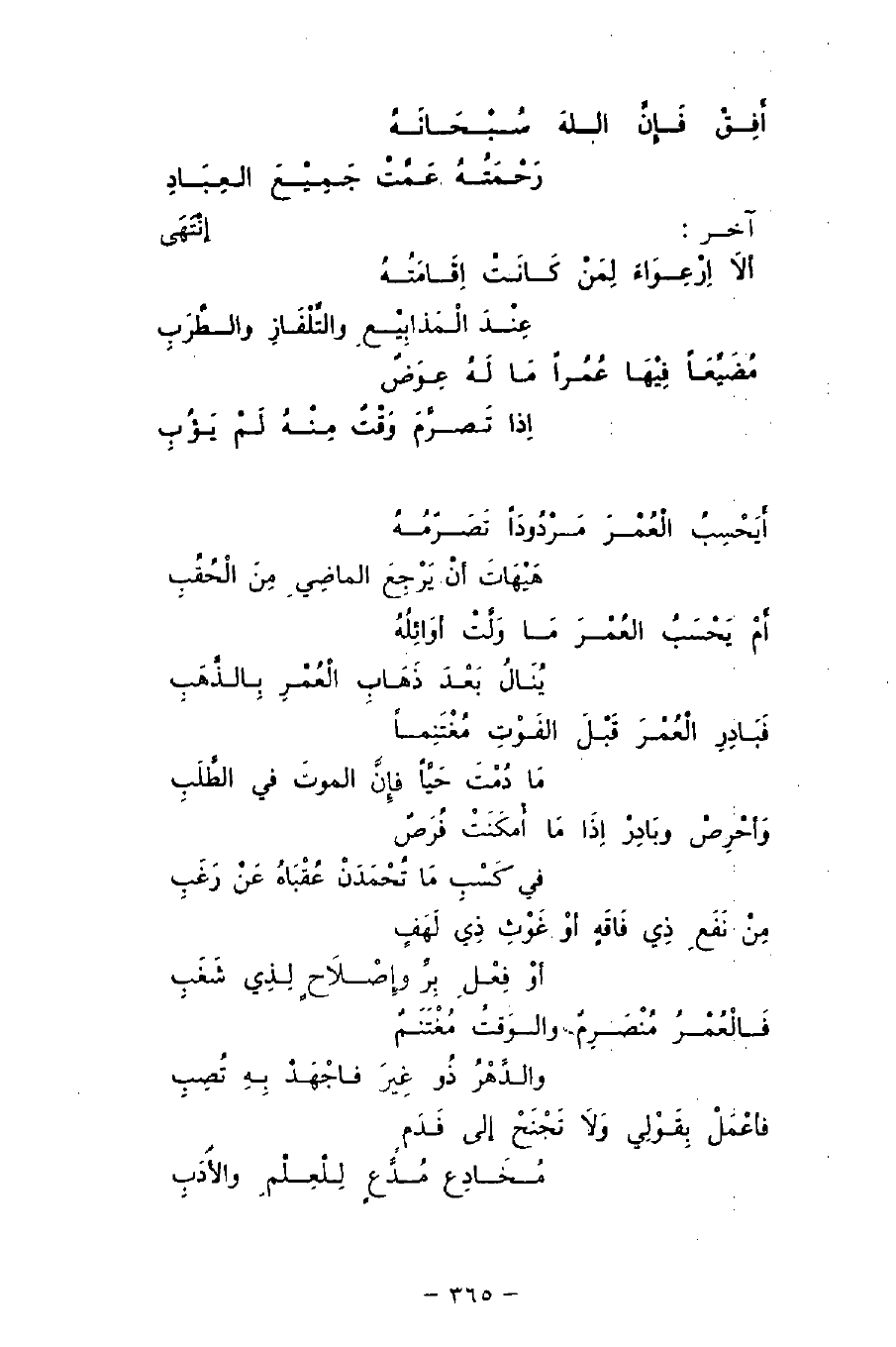 أَمْ يَحْسَبُ العُمْرَ مَا وَلَّتْ أوَائِلُهُ ... يُنَالُ بَعْدَ ذَهَابِ الْعُمْرِ بِالذَّهَبِ