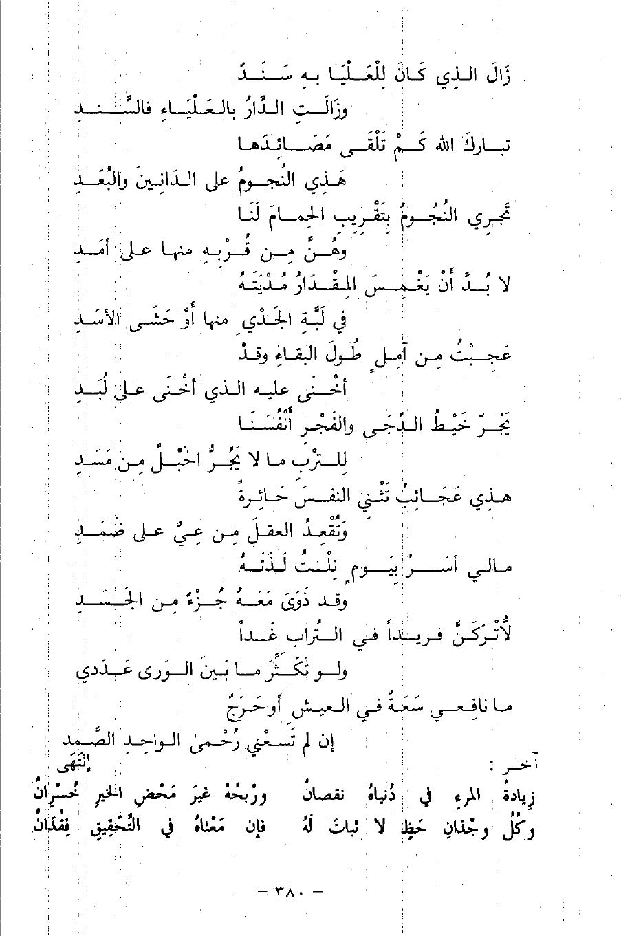 هذِي عَجَائِبُ تَثْنيِ النفسَ حَائِرةً ... وَتُقْعِدُ العقلَ مِن عَيٍّ على ضَمَدِ