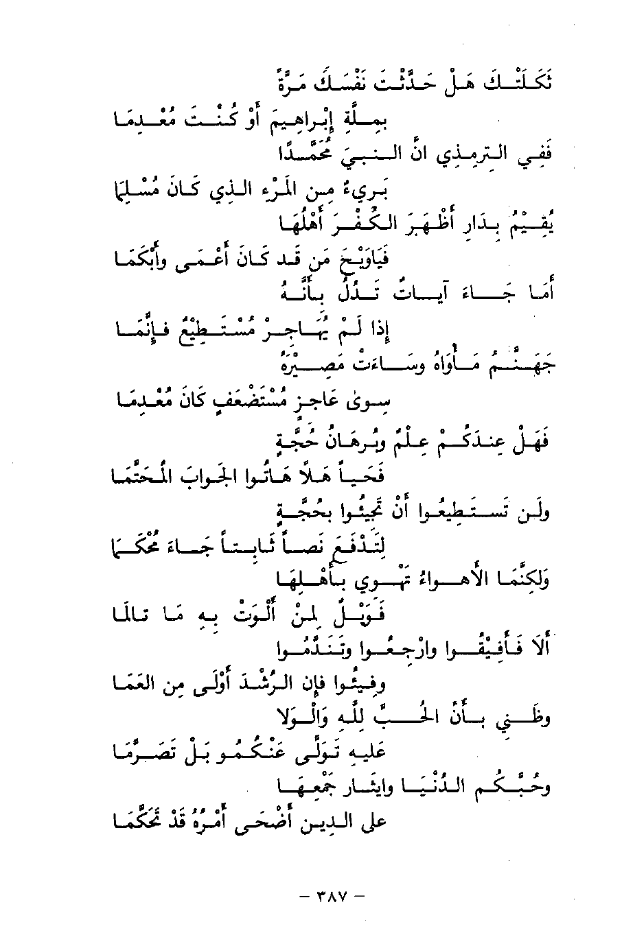 ثَكَلَتْكَ هَلْ حَدَّثْتَ نَفْسَكَ مَرَّةً ... بمِلَّةِ إِبْراهِيمَ أَوْ كُنْتَ مُعْدِمَا ...