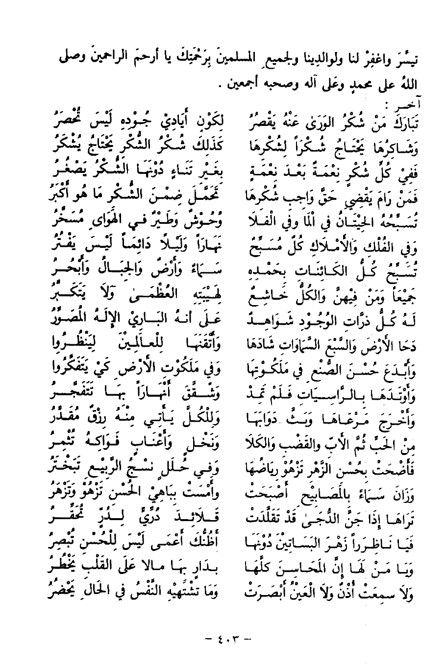 تَبَارَكَ مَنْ شُكْرُ الوَرَى عَنْهُ يَقْصُرُ ... لِكَوْنِ أَيَادِي جُوْدِهِ لَيْسَ تُحْصَرُ