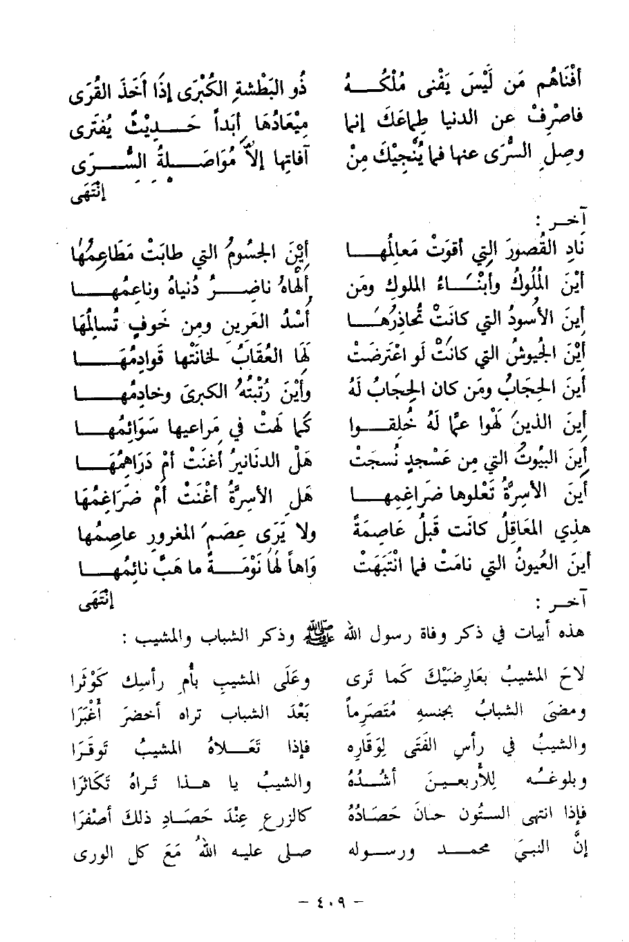 أينَ البيُوتُ التي مِن عَسْجدٍ نُسجَتْ ... هَلُ الدنَانيرُ أغنَتْ أمْ دَرَاهِمُهَا