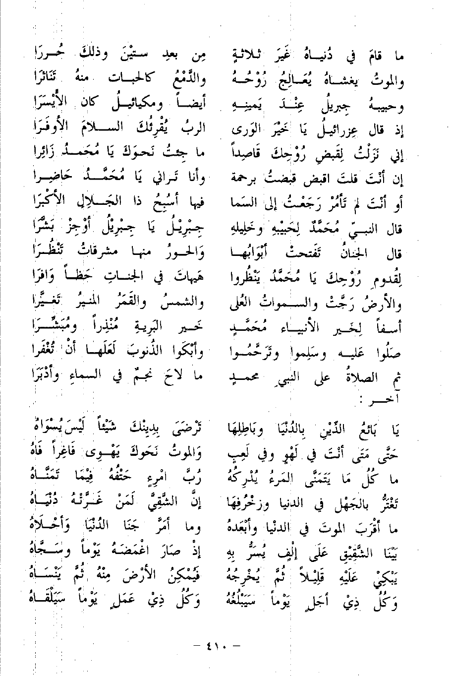 إنِّي نَزَلَتُ لِقَبْضِ رُوحِكَ قَاصِدًا ... مَا جِئْتُ نَحْوَكَ يَا مُحمدُ زَائِرًا ...