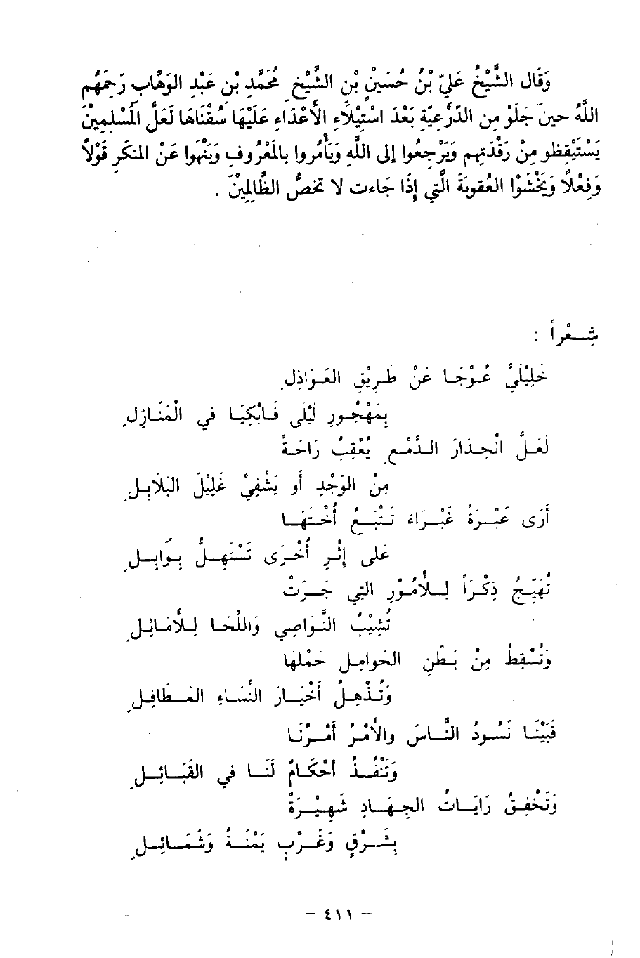 وَقَال الشَّيْخَ عَليّ بْنُ حُسَيْنٍ بْن الشَّيْخِ مُحَمَّدِ بْن عَبْدِ الوَهَّاب رَحَمِهُم اللهُ، حينَ جَلَوْ مِن الدّرْعِيّةِ بَعْدَ اسْتِيْلاءِ الأَعْدَاءِ عَلَيْهَا، سُقْنَاهَا لَعَلَّ المُسْلِميْن يَسْتَيْقِظون مِنْ رَقْدَتِهم، وَيَرْجِعُون إلى اللهِ، وَيَأْمُرون بالمَعْرُوفِ، وَيَنْهَون عَنْ المنكَرِ قَوْلاً وَفِعْلا، ً وَيَخْشَوْن العُقوبَةَ الَّتي إِذا جَاءت لا تخصًّ الظَّالِمِيْنَ.