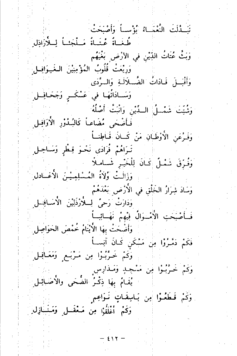 تَبَدَّلَتَ النَّعْمَاءُ بُؤْسًا وَأَصْبَحَتْ ... طُغَاةٌ عُتَاةٌ مَلْجَئًا لِلأَرَاذِلِ