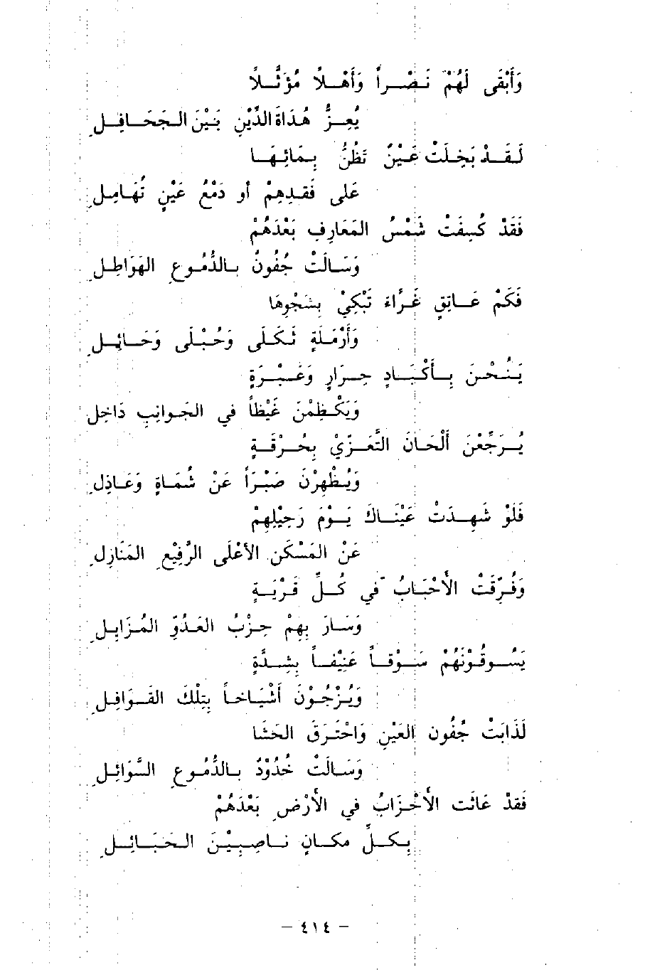 فَقَدْ كُسِفَتْ شَمْسُ المَعَارِفِ بَعْدَهُمْ ... وَسَالَتْ جُفُونٌ بالدُّمُوعِ الهَوَاطِلِ
