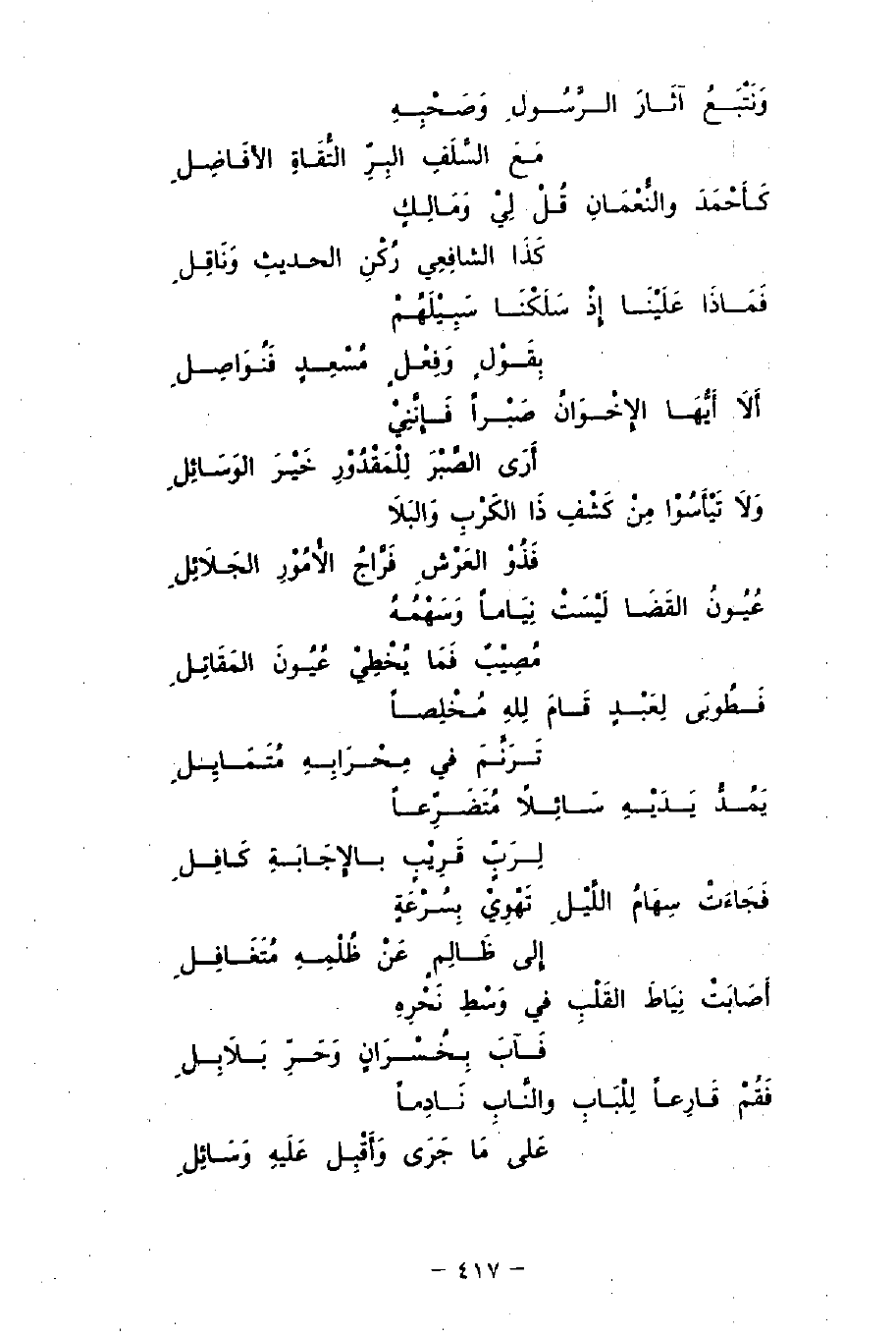 وَنَتْبَعُ آثَارَ الرَّسُولِ وَصَحْبِهِ ... مَعَ السَّلَفِ البِرِّ التُّقَاةِ الأفَاضِلِ