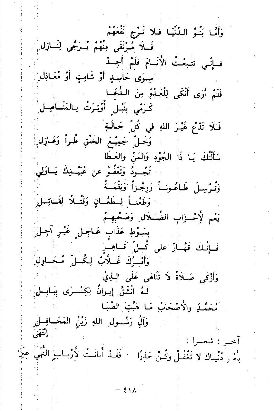 مُحَمَّدُ والأَصْحَابُ مَا هَبَّتِ الصَّبَا ... وَآلُ رَسُولِ اللهِ زَيْنُ المَحَافِلِ