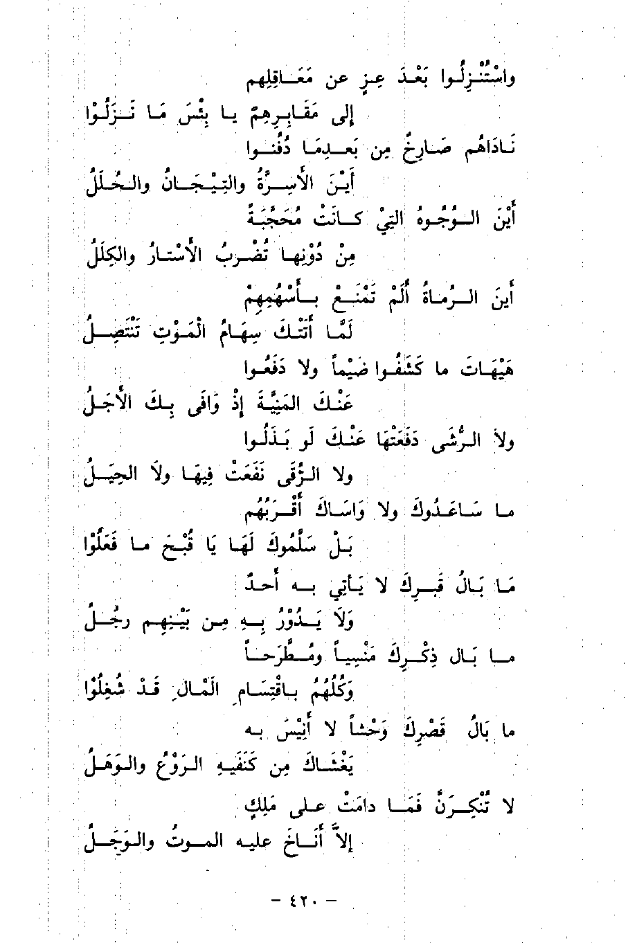 واسْتُنْزِلُوا بَعْدَ عِزٍ عن مَعَاقِلِهم ... إِلى مَقَابِرِهِمْ يا بئْسَ مَا نَزَلُوْا