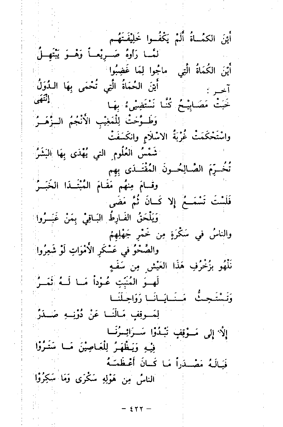 أَيْنَ الكُمَاةُ الَّتِي ماجُوا لِمَا غَضِبُوا ... أَيْنَ الحُمَاةُ الَّتِي تُحْمَى بِهَا الدُوَلُ