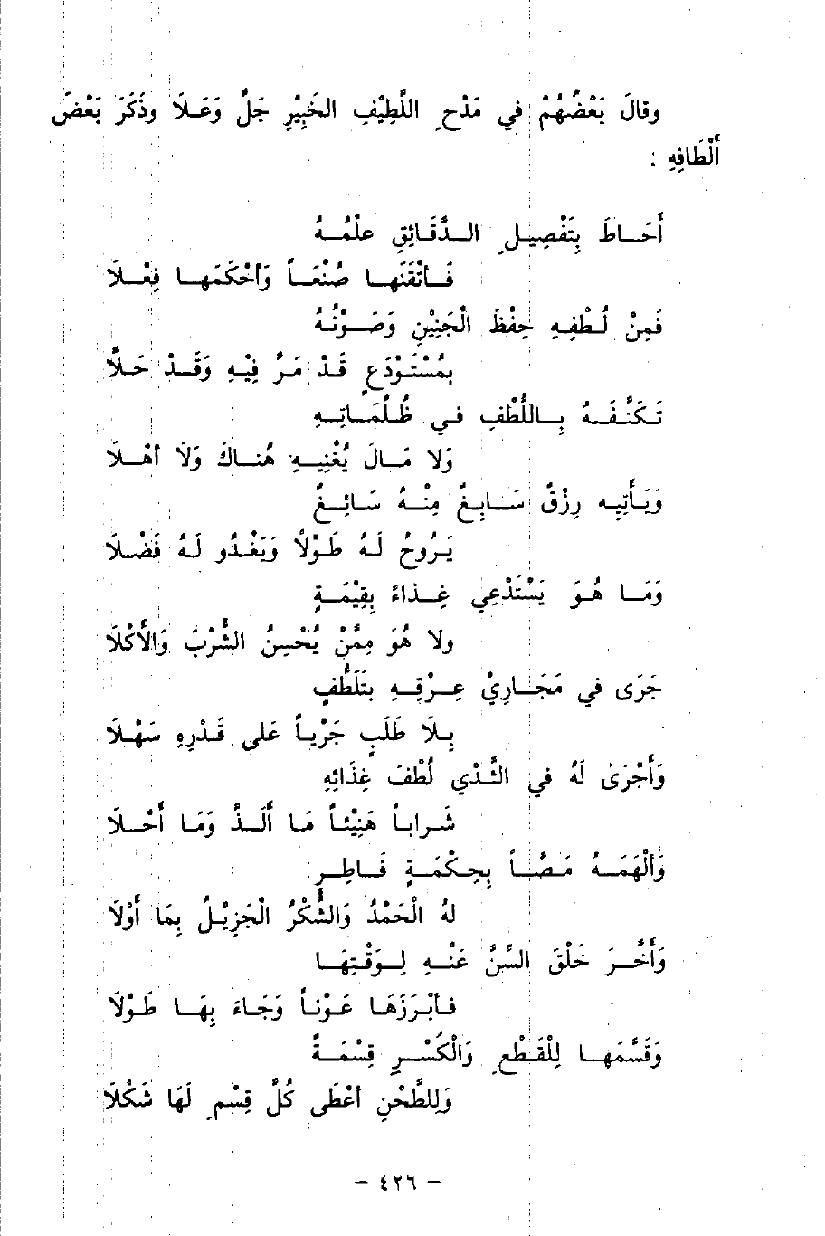 وقالَ بَعْضُهُمْ في مَدْحِ اللَّطِيْفِ الخَبِيْرِ جَلَّ وَعَلاَ وَذَكَرَ بَعْضَ أَلْطَافِهِ: