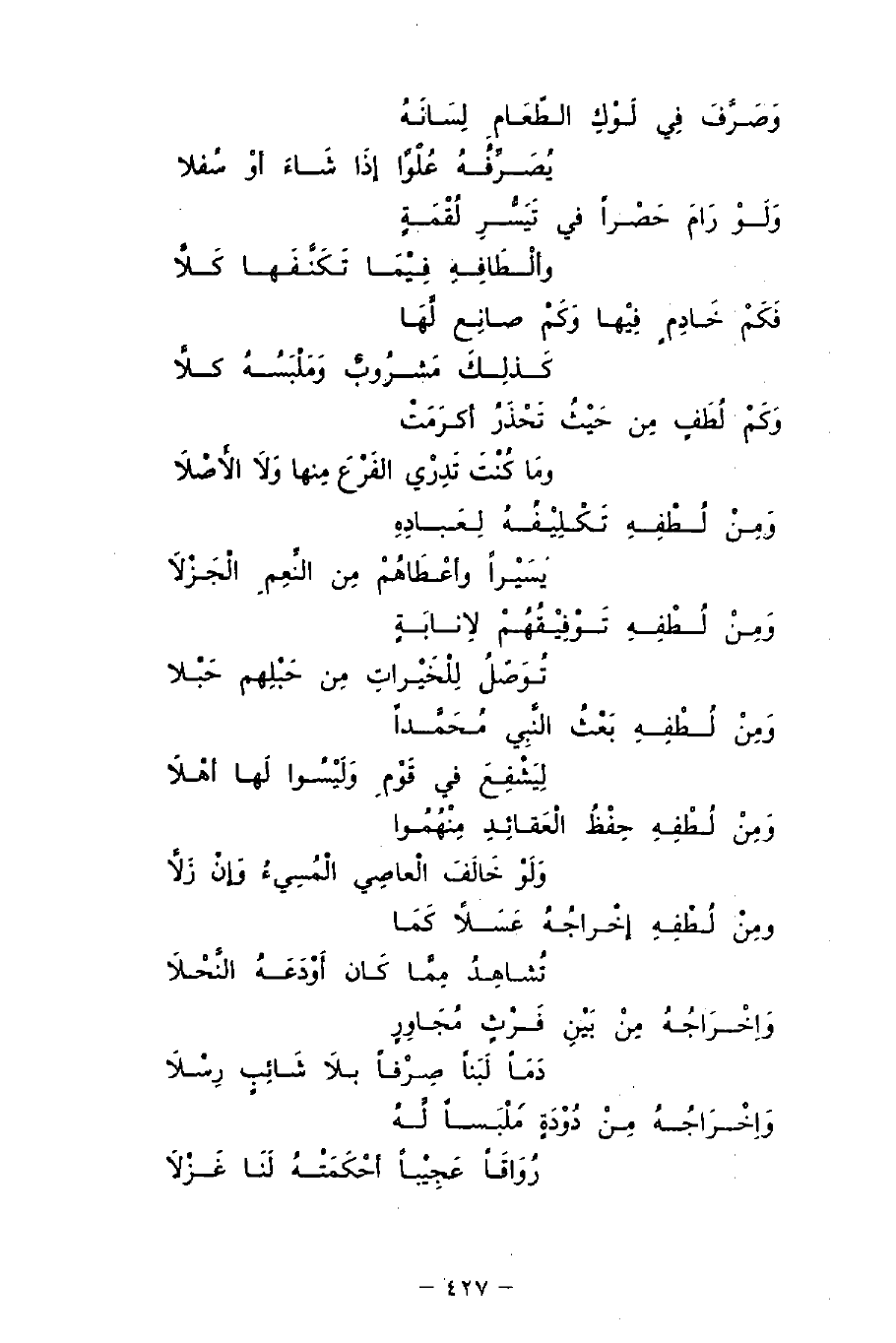 وَمِنْ لُطْفِهِ تَكْلِيْفُهُ لِعَبادِهِ ... يسَيْرًا وأعْطَاهُمْ مِن النِّعِمِ الْجَزْلاَ
