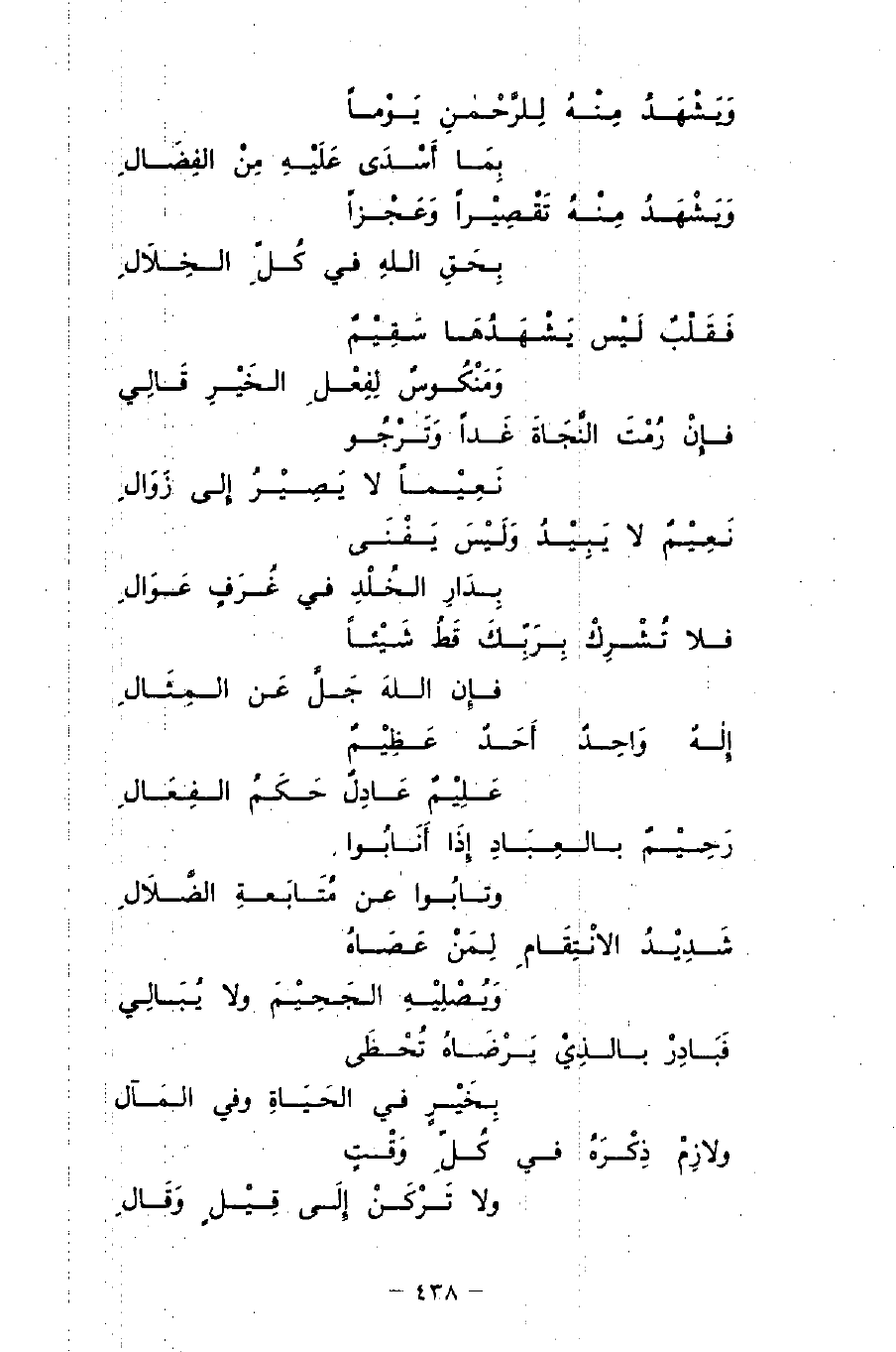 فلا تُشْرِكْ بِرَبِّكَ قَطُ شَيْئًا ... فإِن اللهَ جَلَّ عَن المِثَالِ