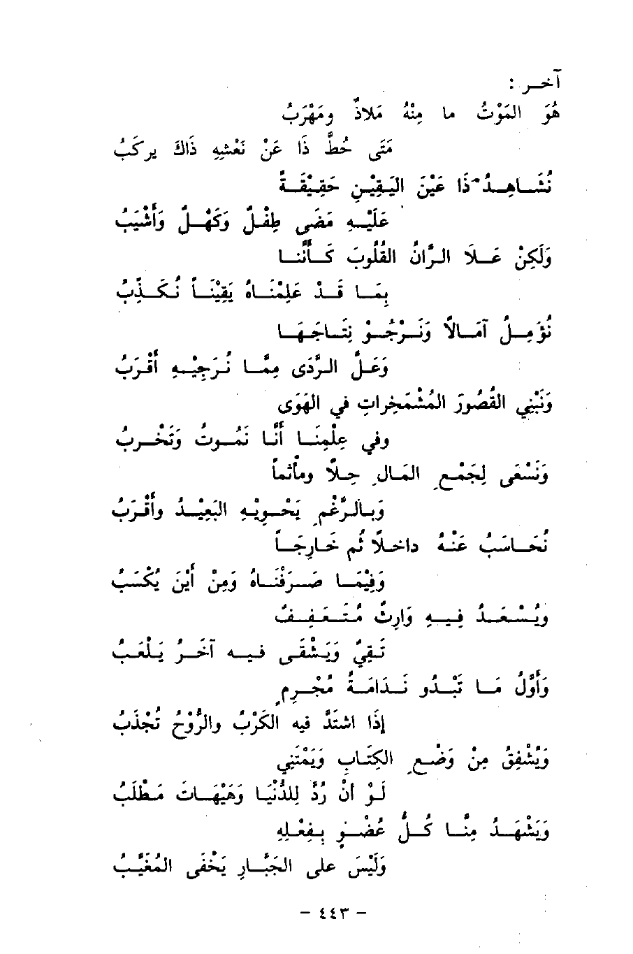 وَيُشْفِقُ مِنْ وَضْعِ الكِتَابِ وَيَمْتَنِي ... لَوْ انْ رُدَّ لِلدُّنْيَا وَهَيْهَاتَ مَطْلَبُ