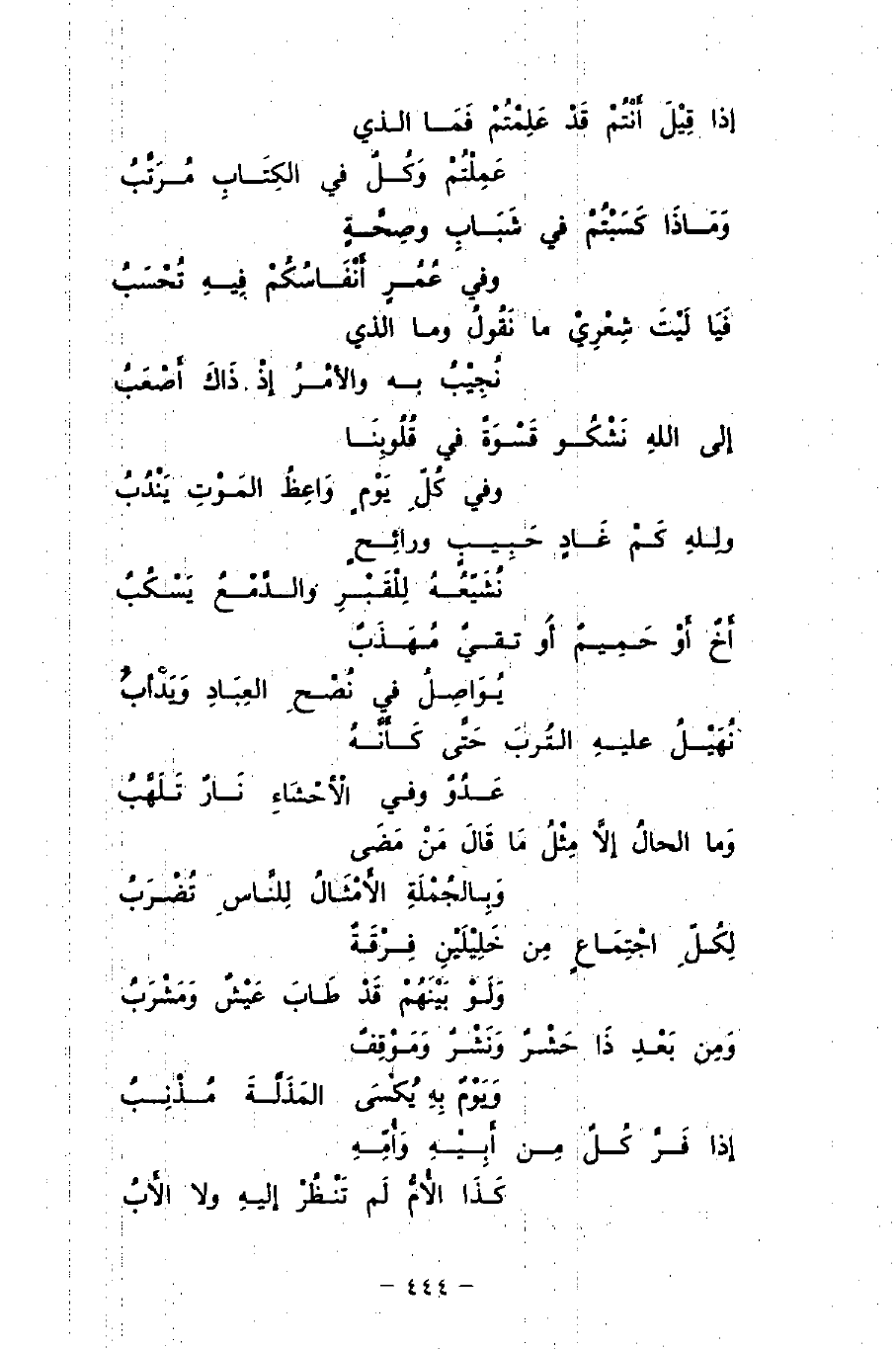 ولله كَمْ غَادٍ حَبِيبٍ ورائِحٍ ... نُشَيّعُهُ لِلْقَبْرِ والدَّمْعُ يَسْكُبُ