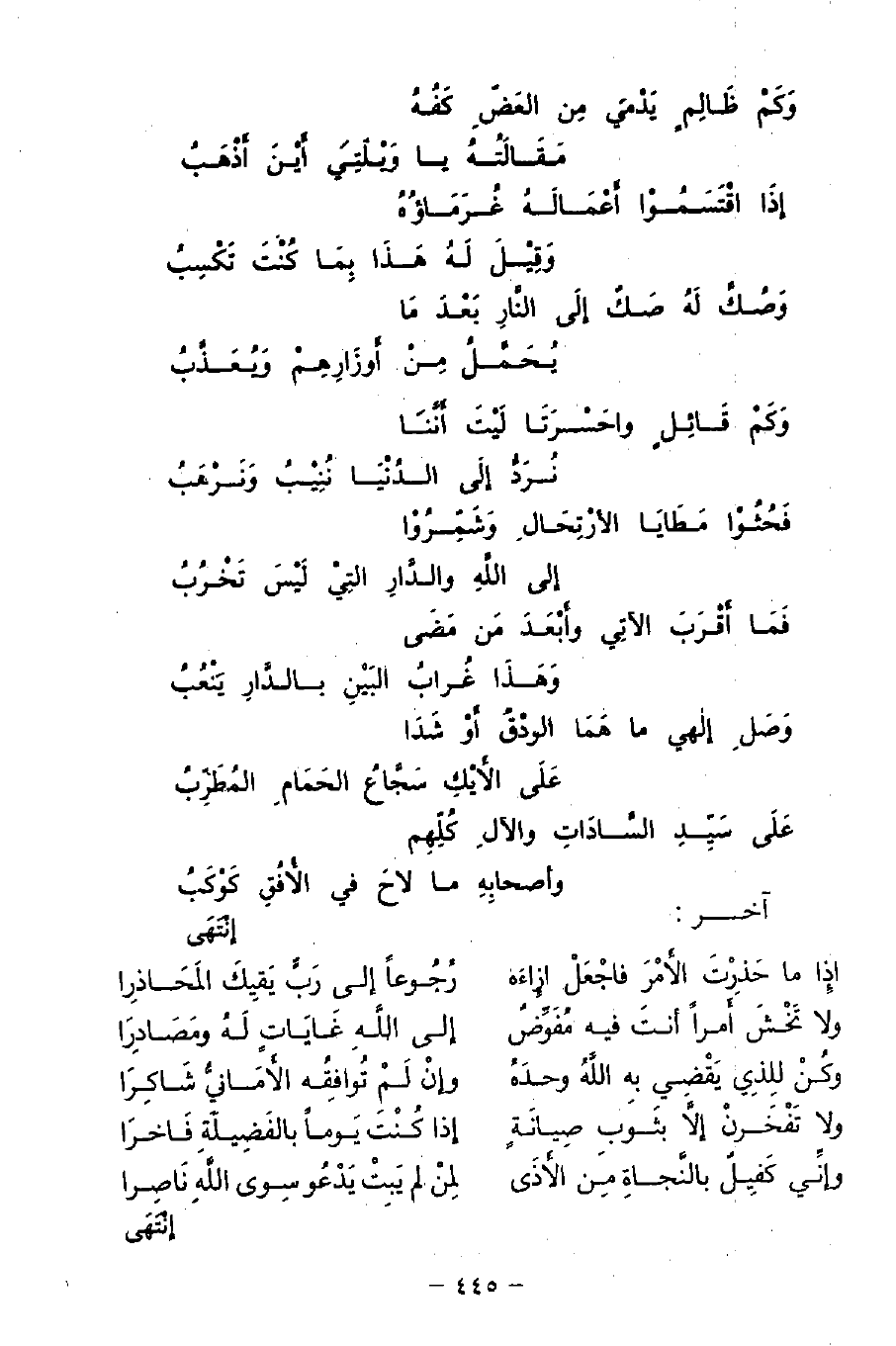وَكَمْ قَائِلٍ واحَسْرَتَا لَيْتَ أَنَّنَا ... نُرَدُّ إِلَى الدُنْيَا نُنِيْبُ وَنَرْهَبُ