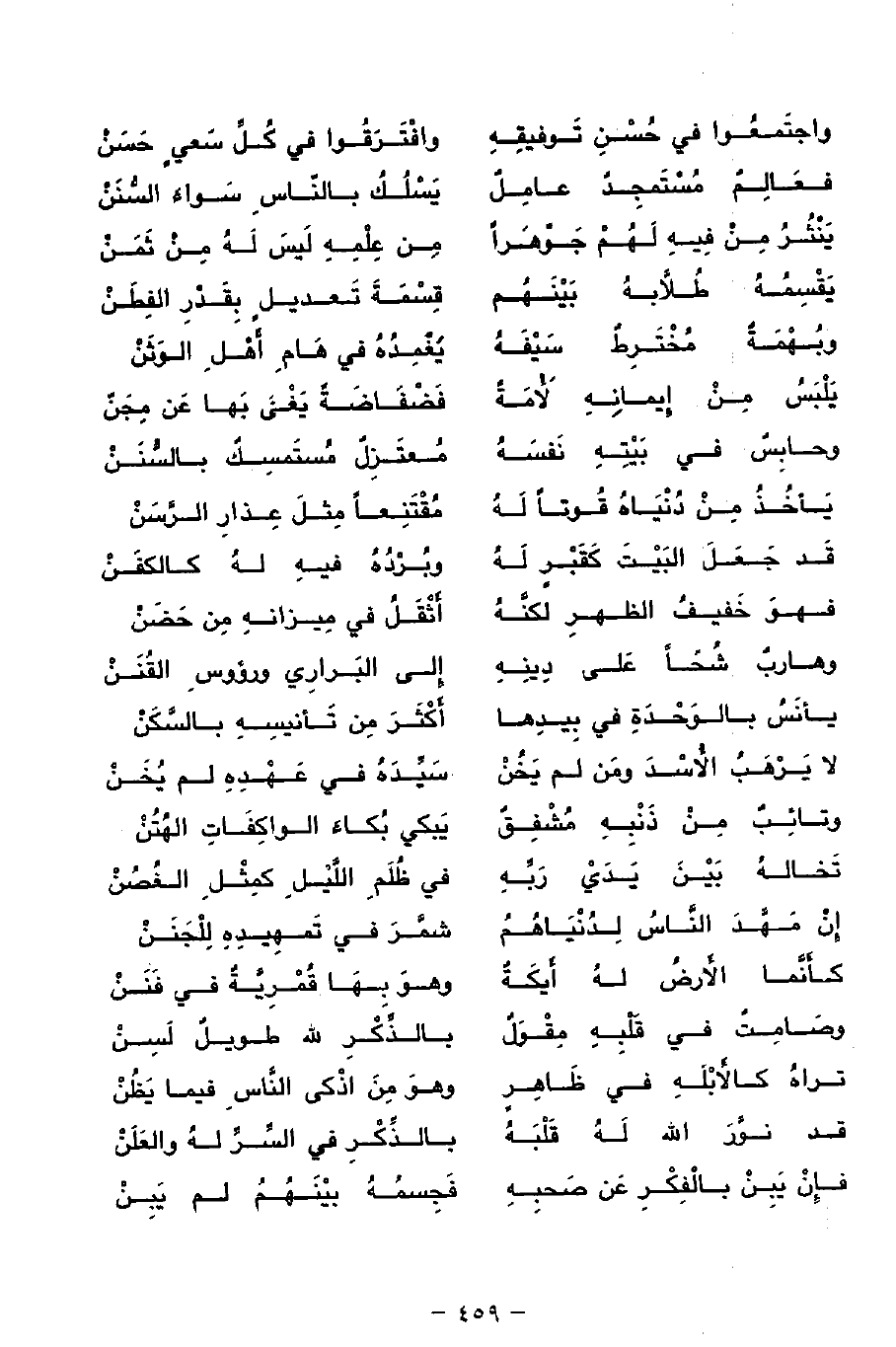 فعَالِمٌ مُسْتَمجِدٌ عامِلٌ ... يَسْلُكُ بالنّاسِ سَواءَ السُّنَنْ
