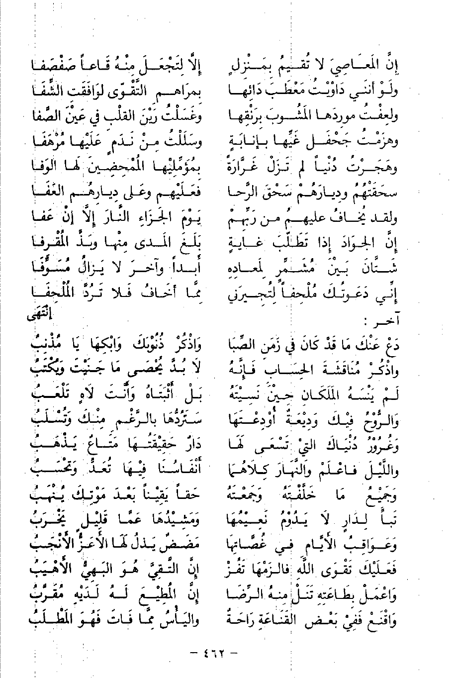 إنَّ المَعَاصِيَ لا تُقيمُ بِمَنْزِلٍ ... إِلاَّ لِتَجْعَلَ مِنْهُ قَاعًا صَفْصَفا ...