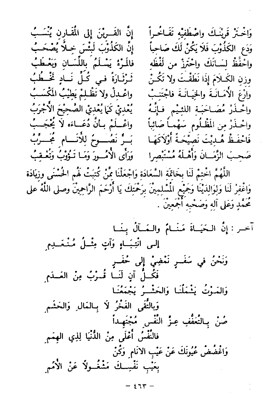 إِنَّ الحَيَاةَ مَنَامٌ والمَآلُ بِنَا ... إلى انْتِبَاهٍ وَآتٍ مِثْلُ مُنْعَدِمِ