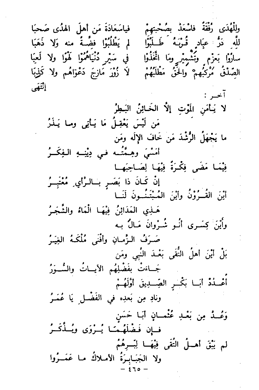 اعْدُدْ أبَا بَكْرٍ الصِّدِيقَ أوَّلَهُمْ ... ونادِ مِن بَعدِه في الفَضْلِ يَا عُمَرُ