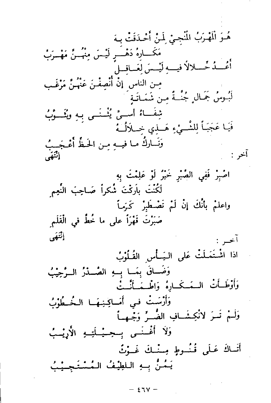 اصْبِرْ فَفِي الصَّبْرِ خَيْرٌ لَوْ عَلِمْتَ بِهِ ... لَكُنْتَ بارَكْتَ شُكرًا صَاحِبَ النِّعِمِ