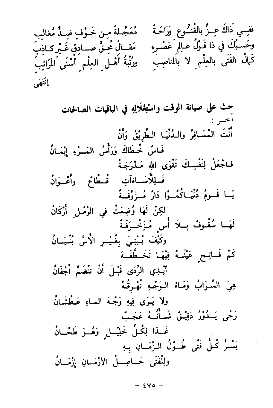أَنْتَ المُسَافِرُ والدُنْيَا الطَّرِيْقُ وَأَنْـ ... ـفَاسٌ خُطَاكَ وَرَأْسُ المَرْءِ إيْمَانُ
