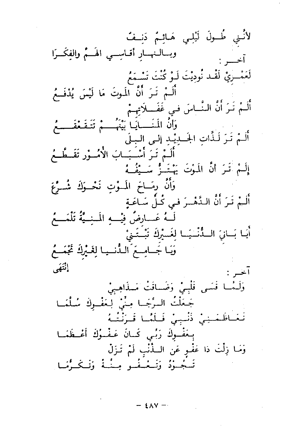 أَلَمْ تَرَ لَذَّاتِ الجَدِيْدِ إلى البلَى ... أَلَمْ تَرَ أَسْبَابَ الأُمُوْر تَقَطَّعُ