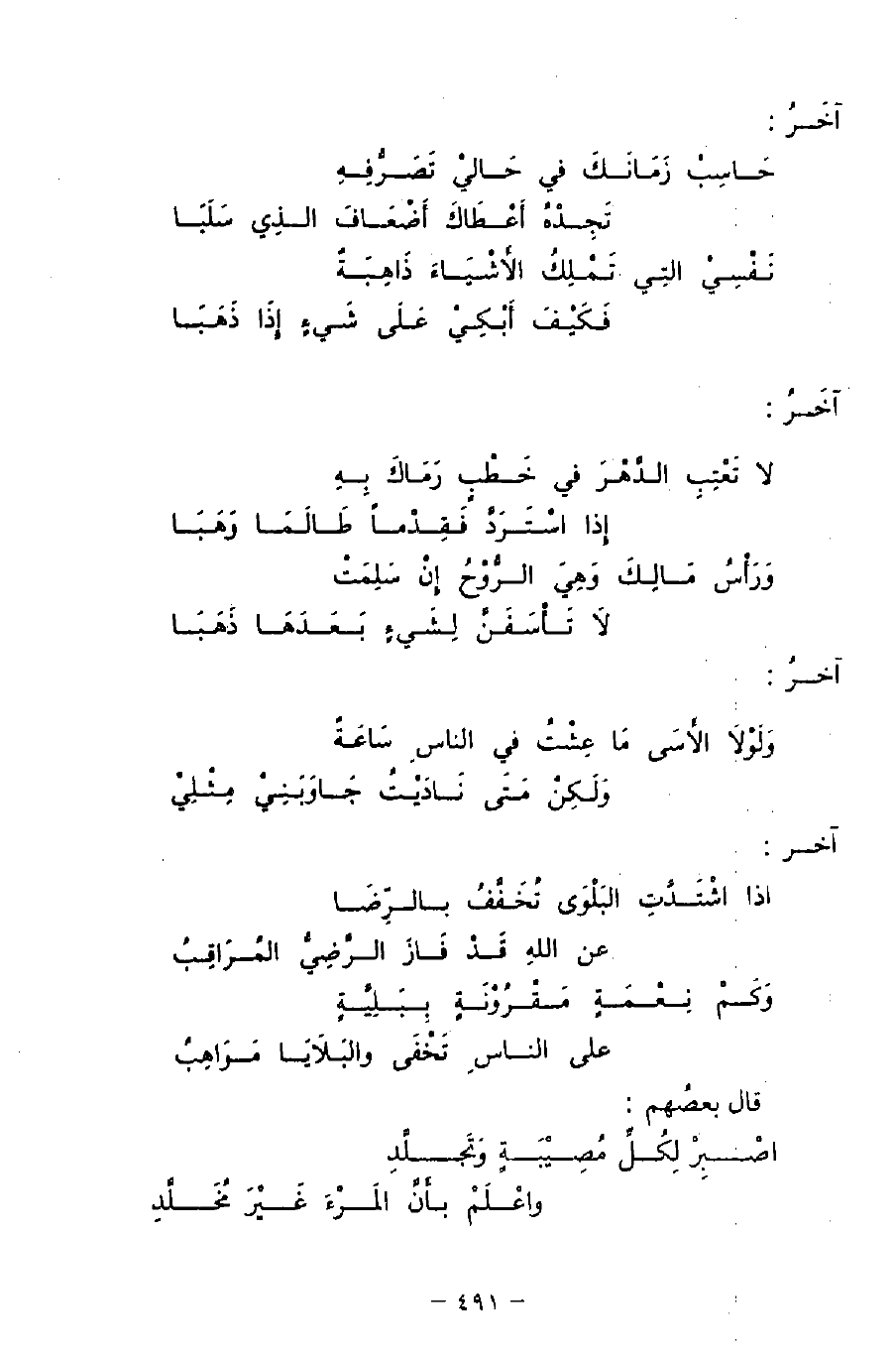 نَفْسِيْ التِي تَمْلكُ الأَشْيَاءَ ذَاهِبَةٌ ... فَكَيْفَ أَبْكِيْ عَلَى شَيءٍ إِذَا ذَهَبَا