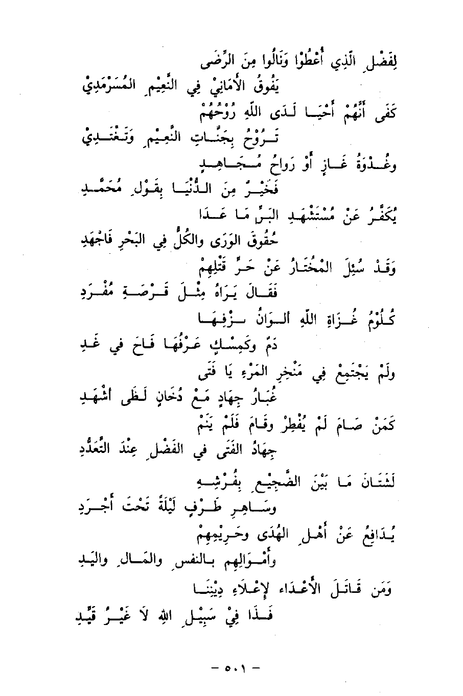 وَمَن قَاتَلَ الأَعْدَا لإِعْلاَءِ دِيْنِنَا ... فَذَا فِيْ سَبِيْلِ اللهِ لاَ غَيْرُ قَيِّدِ