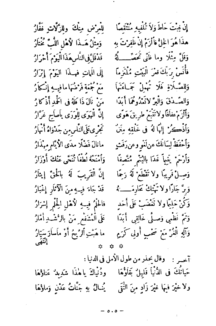 ولا خَيْرَ فيْهَا غَيْرَ زَادٍ مِنَ التَّقَى ... يُنالُ بِهِ جَنَّاتُ عَدْنٍ وَمَاؤُهَا