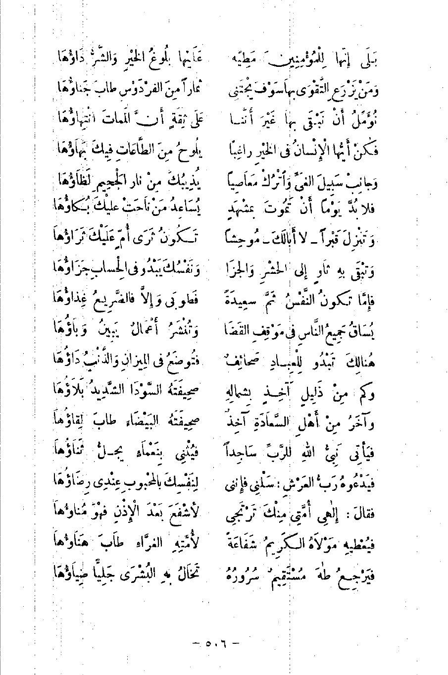 وَمَنْ يَزْرَعِ التَّقْوى بِهَا سَوْفَ يَجْتَنِي ... ثِمَارًا مِنَ الفِرْدَوْسِ طَابَ جَنَاؤُهَا