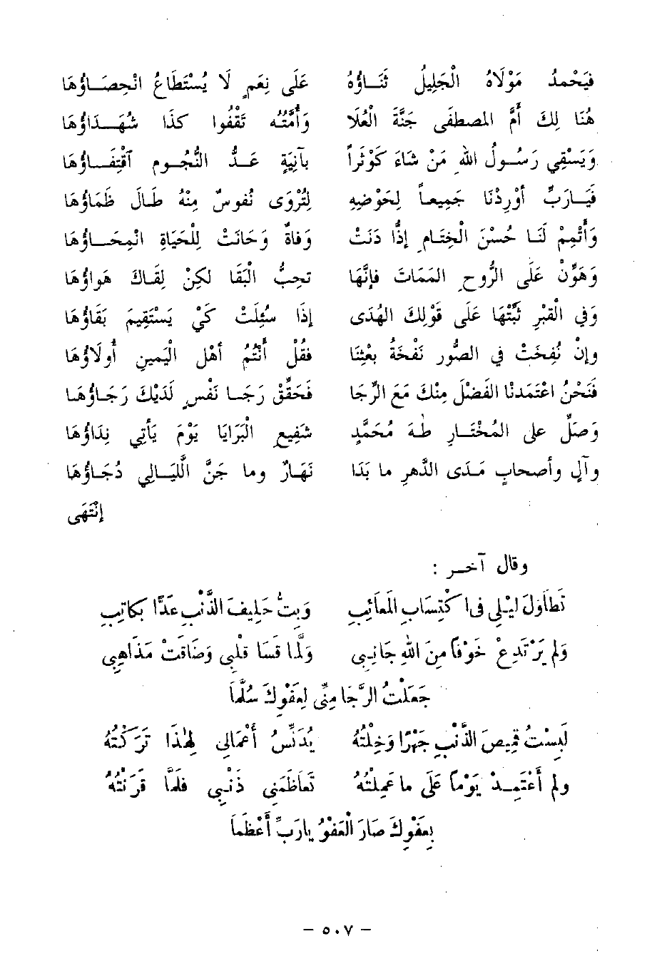 فيَحْمدُ مَوْلاَهُ الْجَلِيلُ ثَنَاؤُهُ ... عَلَى نِعَمٍ لاَ يُسْتَطَاعُ انْحِصَاؤُهَا