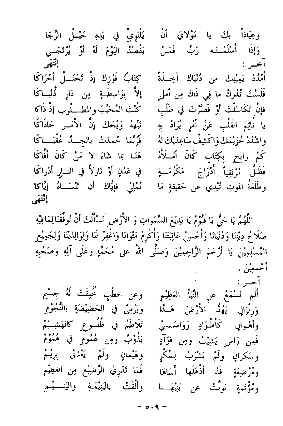 اللَّهُمَّ يَا حَيُّ يَا قَيُّوْمُ يَا بَدِيْعَ السَّمَواتِ وَالأَرْضِ، نَسْأَلُكَ أنْ تُوفَّقَنَا لِمَا فِيْهَ صَلاَحُ دَيْنِنَا وَدُنْيَانَا، وَأَحْسِنْ عَاقَبَتَنَا وَأَكْرِمْ مَثْوَانَا، وَاغْفِرْ لَنَا وَلِوَالِدَيْنَا وَلِجَمِيْعِ المُسْلِمِيْنَ يَا أَرْحَمَ الرَّاحِمِيْنَ، وَصَلَّى الله على مُحَمَّدٍ وعَلَى آلِهِ وصَحْبِهِ أجْمعِيْنَ. ...