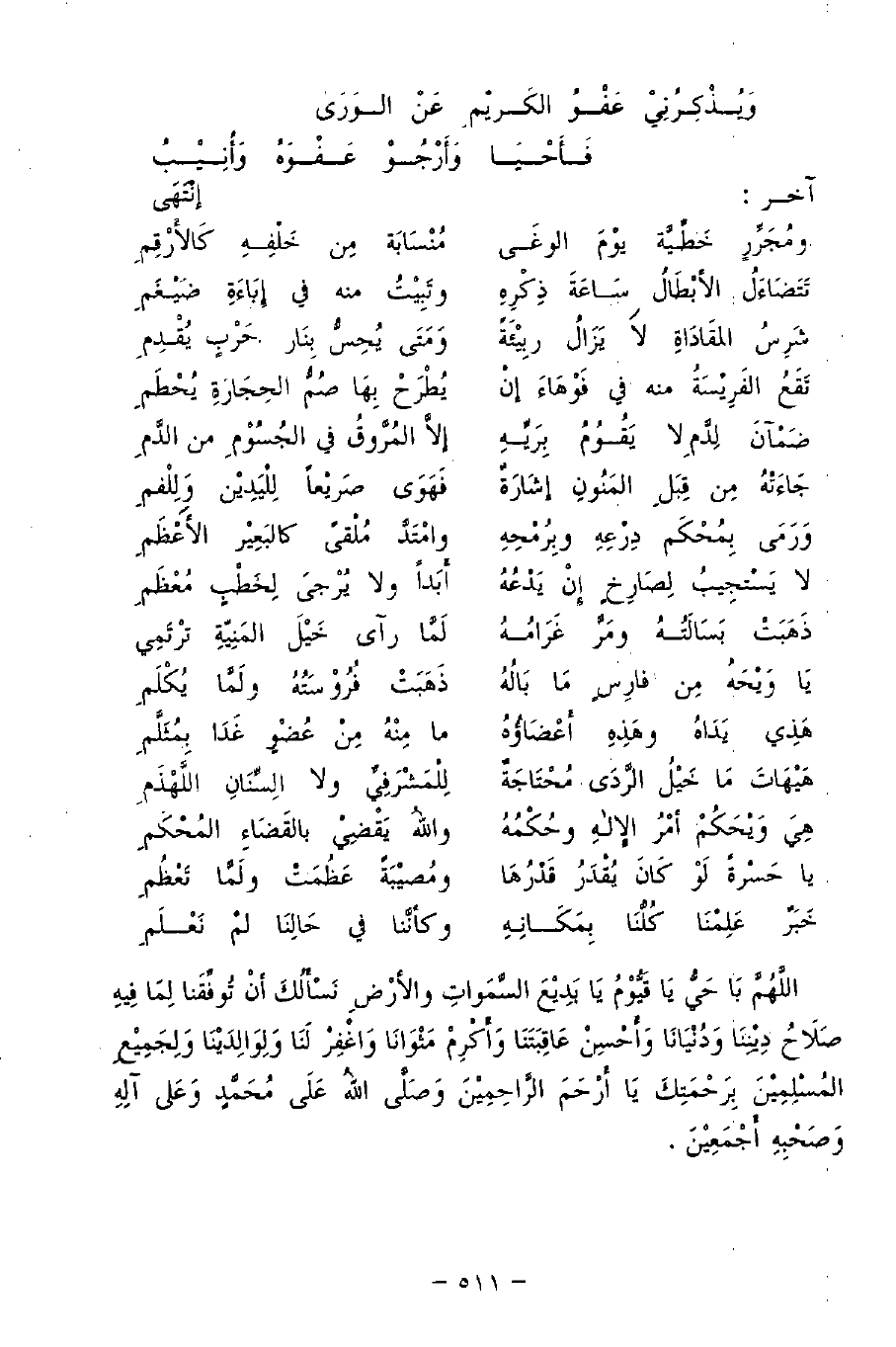 اللَّهُمَّ يَا حَيُّ يَا قَيُّوْمُ يَا بَدِيْعَ السَّمَواتِ وَالأَرْض، نَسْأَلُكَ أنْ تُوفَّقَنَا لِمَا فِيْهَ صَلاَحُ دَيْنِنَا وَدُنْيَانَا، وَأَحْسِنْ عَاقَبَتَنَا وَأَكْرِمْ مَثْوَانَا، وَاغْفِرْ لَنَا وَلِوَالِدَيْنَا وَلِجَمِيْعِ المُسْلِمِيْنَ برحمتك يَا أَرْحَمَ الرَّاحِمِيْنَ، وَصَلَّى الله على مُحَمَّدٍ وعَلَى آلِهِ وصَحْبِهِ أجْمعِيْنَ.