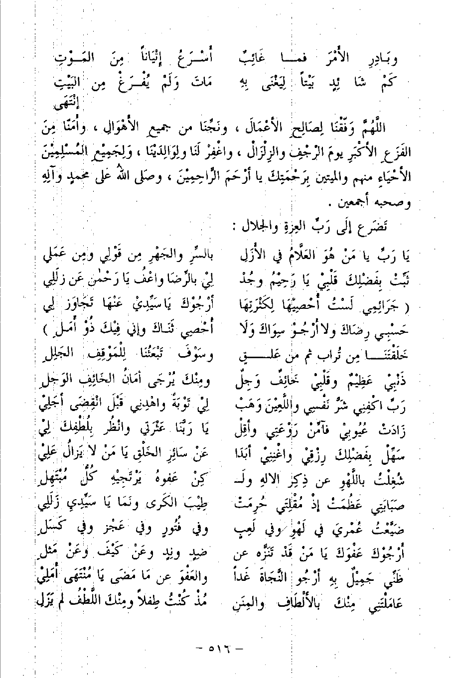 رَبِّ اكْفِنِي شَرَّ نَفْسِي واللَّعِيْنَ وَهَبْ ... لِيْ تَوْبَةً واهْدِنِي قَبْلَ انْقَضَى أجَلِي